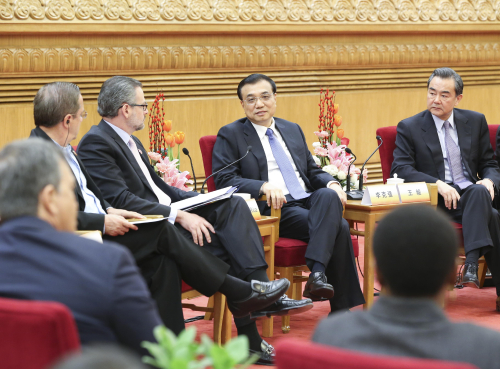 A PROMISING PLATFORM: Chinese Premier Li Keqiang (second right) meets with heads of delegations attending the First Ministerial Meeting of the Forum of China and the Community of Latin American and Caribbean States in Beijing on January 9 (DING LIN) |