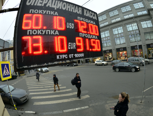 SHARP DROP: Pedestrians walk under a sign listing foreign currency rates against the Russian ruble outside an exchange office in central Moscow, as the nation's depreciating currency intensifies troubles for the Russian economy (YURI KADOBNOV/CFP) |