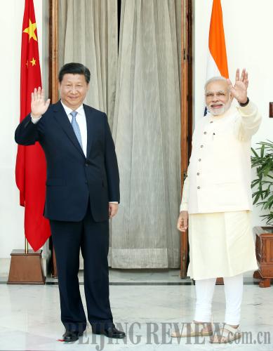 CHINDIA: Chinese President Xi Jinping and Indian Prime Minister Narendra Modi greet the media in New Delhi, India, on September 18, 2014 (YAO DAWEI) |