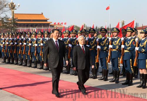 SHOULDER TO SHOULDER: General Secretary of the Central Committee of the Communist Party of China Xi Jinping holds a welcoming ceremony for Nguyen Phu Trong, General Secretary of the Central Committee of the Communist Party of Viet Nam, before their talks in Beijing on April 7 (XINHUA) |