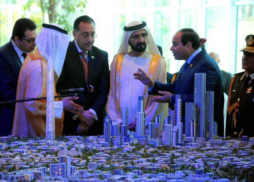 CAPITAL INVESTMENT: Egyptian President Abdel Fattah al-Sisi (right) talks with Prime Minister of the United Arab Emirates Sheikh Mohammed bin Rashid al-Maktoum (second right) as they viewed a scale model of Egypt's planned new capital displayed at an investment conference in the Red Sea resort of Sharm el-Sheikh on March 14 (XINHUA/AFP) |