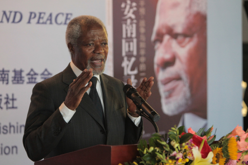 MAKING A CASE: Former UN Secretary General Kofi Annan addresses an audience during his book launch in Beijing on April 22 (WANG XIANG) |