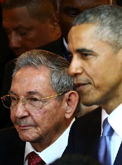 U.S. President Barrack Obama and Cuban President Raul Castro meet at the opening ceremony of the Seventh Summit of the Americas in Panama City, capital of Panama, on April 10 (XINHUA) |