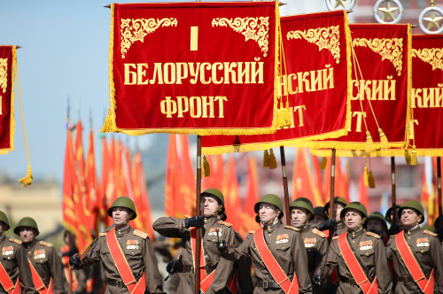 Russian soldiers, wearing the uniforms of the 1940s and holding military flags of the Great Patriotic War, goose step in the parade | |