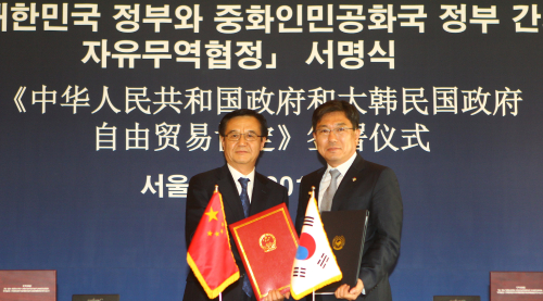 Chinese Minister of Commerce Gao Hucheng (left) and South Korean Minister of Trade, Industry and Energy Yoon Sang Jick sign the Free Trade Agreement in Seoul on June 1 (XINHUA) |