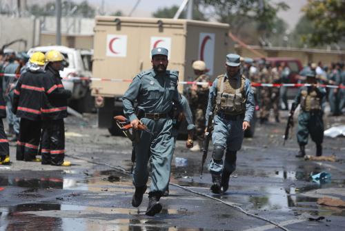 Police guard the site of a car bombing attack that killed at least four people in Kabul, capital of Afghanistan, on August 10 (XINHUA) |