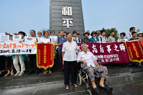 Survivors of the 1937 Nanjing Massacre Xia Shuqin (left) and Chen Guixiang (right) attend an assembly marking the 70th anniversary of the victory of the Chinese People's War of Resistance Against Japanese Aggression in Nanjing on August 15 (XINHUA) |