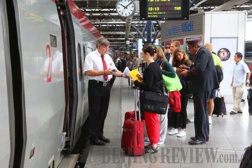 A railway employee checks tickets of passengers about to board a Thalys international service on a platform at Brussels Station, Belgium, on August 25 (XINHUA) |