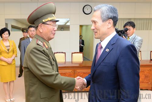 Hwang Pyong So (left), Director of the General Political Bureau of the Korean People's Army of North Korea, shakes hands with Kim Kwan Jin, chief of South Korea's National Security Office, after their talks at the Panmunjom truce village on August 25 (XINHUA) |