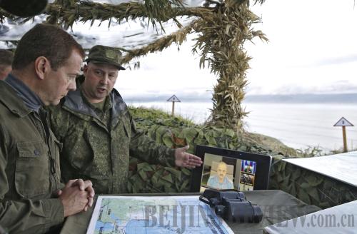 Russian Prime Minister Dmitry Medvedev (left) pays a working visit to the disputed Iturup Island on August 22 (CFP) |
