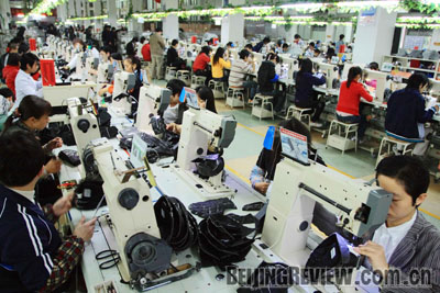 STRUGGLE FOR SURVIVAL: Small export-oriented companies are having a hard time as China sticks to a tight monetary policy. This photo shows employees working in a garment factory in Quanzhou in southeastern Fujian Province