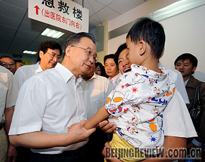 CARE GIVER: Premier Wen Jiabao visits children affected by tainted milk powder in Beijing Children's Hospital on September 21 (RAO AIMIN)