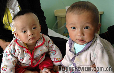 DOUBLE THE PAIN: Twins from Minxian County, west China's Gansu Province, are diagnosed to develop kidney stones by drinking tainted milk and get treatment in a hospital in Lanzhou, the capital city of the province (ZHU GUOLIANG)