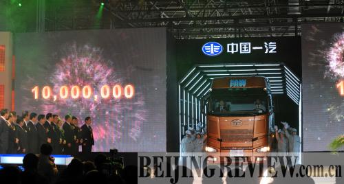 Celebrating Giant: China's 10-millionth auto in 2009 rolls off the production line of the China FAW Group in Changchun on October 20 |