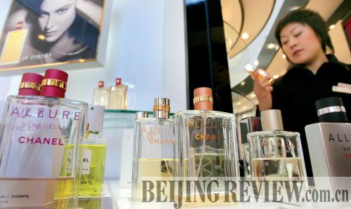 SMELLS GOOD: A woman looks at various foreign perfume brands in a department store in Nanjing, capital of Jiangsu Province (CFP) |