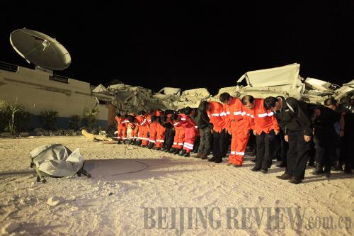 A SILENT TRIBUTE: Chinese rescue team members as well as officials from China's Ministry of Public Security and Ministry of Foreign Affairs stand in a silent salute to fallen Chinese peacekeepers in Port-au-Prince on January 16 (XING GUANGLI) |