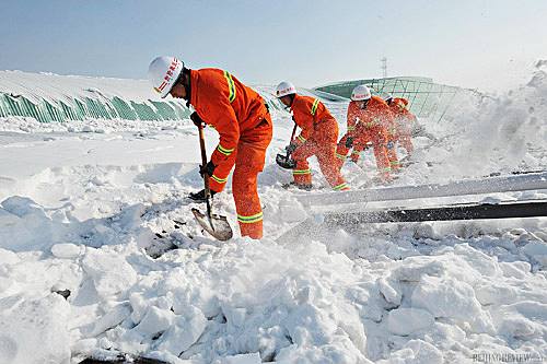 MINIMIZING LOSSES: Firefighters clear snow from buried flower greenhouses in northwest China's Ningxia Hui Autonomous Region on November 17, 2009 (LIU QUANLONG) |