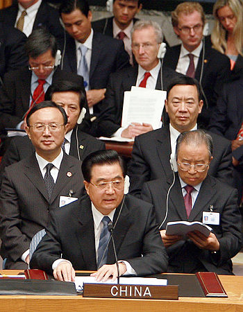 ACTIVE PARTICIPANT: Chinese President Hu Jintao delivers a speech at the UN Security Council summit on nuclear non-proliferation and disarmament in New York on September 24, 2009 (JU PENG) |