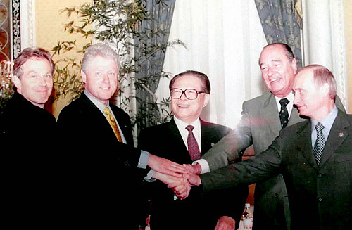 JOINING HANDS: Former Chinese President Jiang Zemin (center) attends the first summit of the permanent members of the UN Security Council in New York on September 7, 2000 (XINHUA) |