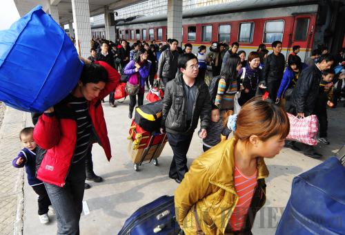 TRANSPORTATION PRESSURE: Passengers walk out of a railway station in Quanzhou, Fujian Province, during this year's Spring Festival. The eastern coastal province reported a passenger transportation volume of 44 million people in the weeklong holiday (WEI PEIQUAN)