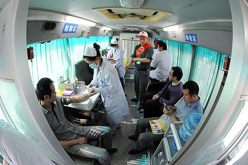 GIVING BLOOD: Volunteers donate blood at a Red Cross blood station in Bozhou City, Anhui Province, on May 6 (CFP)