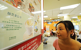 CLEAR DIRECTIONS: A consumer looks at a bulletin about the manufacturing process of KFC's soybean milk at one of the food chain's restaurants in Hefei, capital of Anhui Province (CFP) |