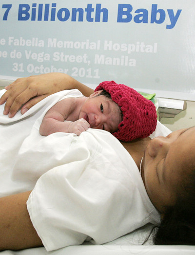 A symbolic 7 billionth baby, named Danica Camacho, rests on her mother's chest on October 31 in a hospital in Manila, the Philippines (XINHUA) |