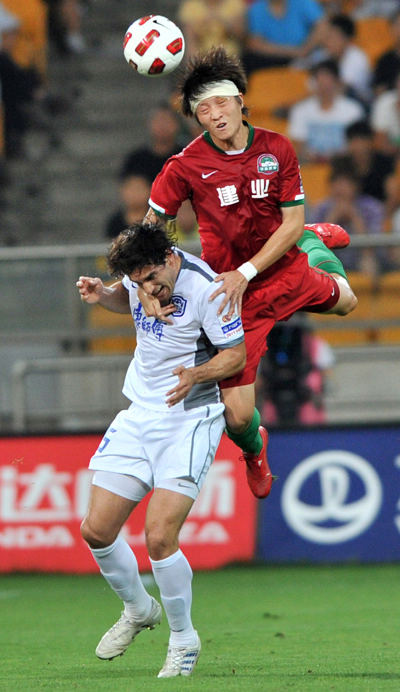 BRAVEHEART: Zhao Peng (right) with the Henan Jianye club scrambles for the ball during a match against Tianjin TEDA in the Chinese Super Leaque on July 14, 2011 (YUE YUEWEI) |
