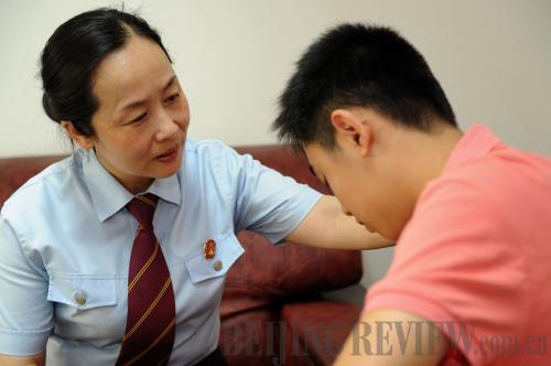 HEALING WITH LOVE: Zhan Hongli, a juvenile court judge in Nanping, Fujian Province, talks to a delinquent on June 16, 2011 (ZHANG GUOJUN) |