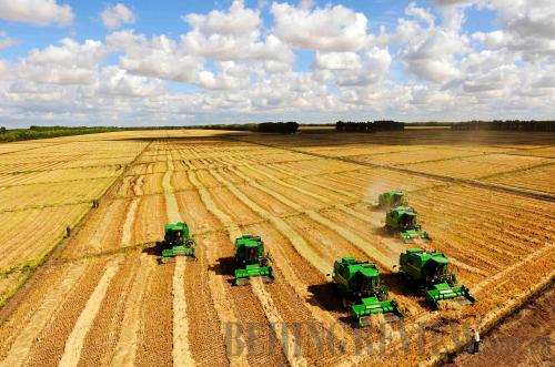 MECHANICAL AGRICULTURE: Farmers harvest their rice with combines at the Friendship Farm in northeast China's Heilongjiang Province in September 2011 (XINHUA)