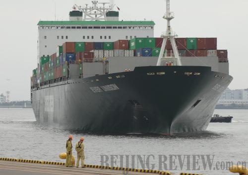 FOREIGN TRADE RELIANCE: A cargo ship arrives at a Tokyo container port on April 19 (XINHUA)