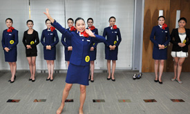 FLYING HIGH: A student from Yunnan Normal University performs traditional dances competing for the stewardess job at Lucky Air, a local airliner based in Kunming, southwest China's Yunnan Province, on May 29 (LIN YIGUANG) |
