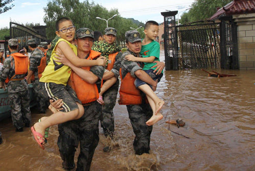 TO THE RESCUE: Rescuers evacuate children from a flood-ravaged school in Beijing's Fangshan District on July 22 (CFP) |