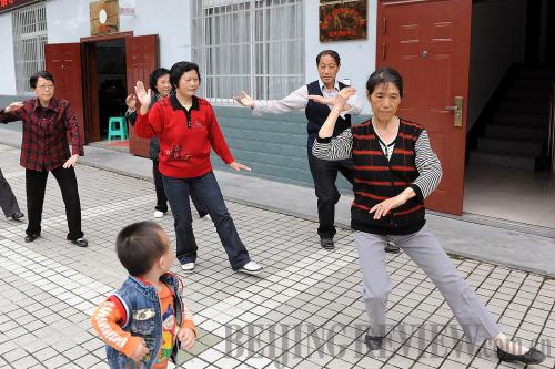 KEEPING FIT: Residents practice taiji in a residential compound in Ankang, north China's Shanxi Province, May 27 (HE JUNCHANG) |