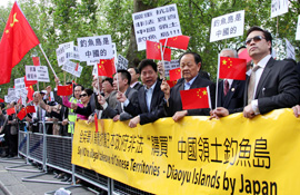 LONDON RAGE: Overseas Chinese hold a demonstration in front of the Japanese Embassy in Britain on September 18 (ZHOU ZHAOJUN) |