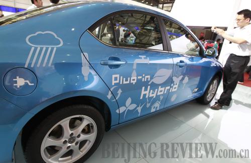 SHINING DEBUT: A customer checks out by a JAC plug-in hybrid car at the 14th Shanghai Auto Show on April 26, 2011 (PEI XIN) |