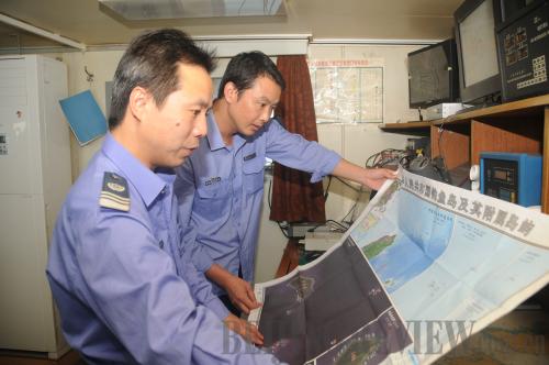 VIGILANCE: Chinese fishery officials look at a map of the Diaoyu Islands aboard a patrol ship in waters off the islands on October 22 (YANG JINZHI) |