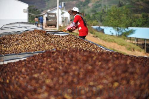 DRYING UP: A woman rakes fresh coffee beans at the Aini Pu'er factory as they dry in the sun before being shipped off to Starbucks in Seattle for roasting (WEI YAO) |