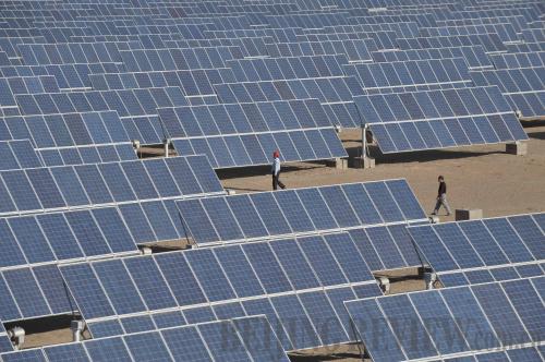 ENERGY FROM THE SKY: Staff members check equipment at a grid-connected solar power generation system in Dunhuang, northwest China's Gansu Province (CFP)