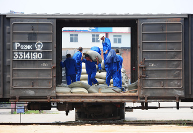 DELIVER MORE GOODS: Workers load a freight carriage at the Xinyang Railway Station in Henan Province on June 21, soon after rail freight service reforms kicked off (XIAO YIJIU) |