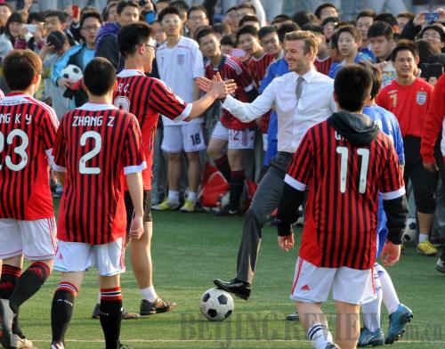 CELEBRITY EFFECT: Former England captain David Beckham, now the ambassador for Chinese soccer, greets teenage soccer players when visiting a middle school in Beijing on March 20 (GONG LEI) |