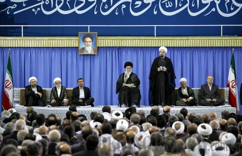 SUPREME SUPPORT: Iran's newly elected president, Hassan Rouhani (third right), speaks at an endorsement ceremony in Tehran, Iran, on August 3. Iran's Supreme Leader Ayatollah Ali Khamenei (fourth right) officially endorsed Rouhani in a ceremony that day (XINHUA)