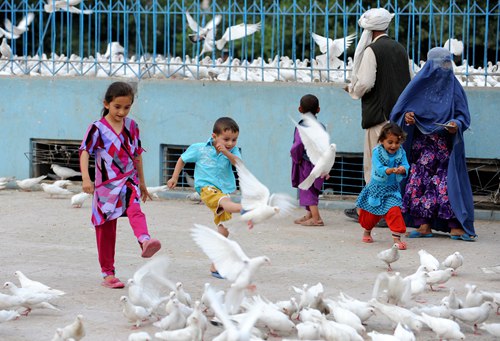 FOR PEACE: Children chase pigeons on a street in Mazar-i-Sharif, Afghanistan, on June 2 (XINHUA/AFP) |
