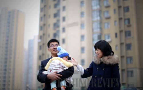 HAPPY LIFE: A couple in Dalian, northeast China's Liaoning Province, take a walk with their son at the community they live in (XINHUA) |