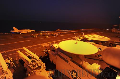 IN ACTION: A press photo released by the U.S. Navy shows an F/A-18C Hornet prepared to launch from the flight deck of the aircraft carrier George H.W. Bush to participate in airstrikes on Islamic State militants in Syria on September 23 (XINHUA/AFP) |
