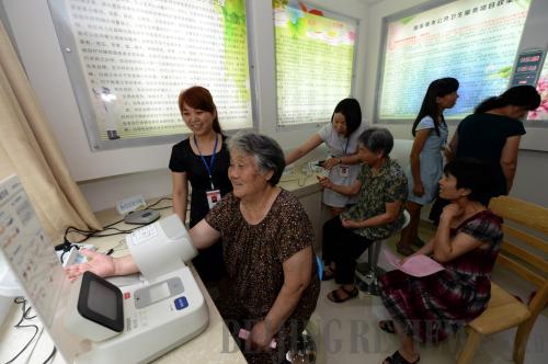FREE MEDICAL SERVICE: A retired woman (second left) receives a free health check-up at her community in Ganzhou, Jiangxi Province, on June 9 (XINHUA) |