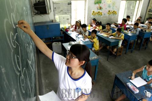 CARING FOR THE LEFT BEHIND: On July 18, a college student teaches an art class in a village of Pingdingshan, Henan Province, for rural students who stay at home while their parents seek opportunities in the cities (XINHUA)
