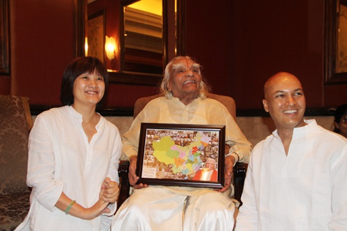 Yin Yan (left) and her husband Yogi Mohan (right) pose with B.K.S. Iyengar, the late Indian yoga guru, during the First China-India Yoga Summit in Guangzhou, south China's Guangdong Province, in June 2011 (COURTESY OF YOGIYOGA) |