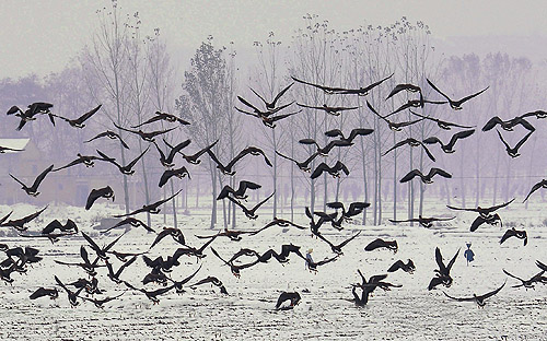 CHEERFUL PLACE: Wild geese come to the Yellow River Wetland Reserve in Mengjin, central China's Henan Province, to pass the winter (WANG SONG) | "Today, China has made great progress in strategic planning, scientific research and improving public awareness," Zhou said, adding that 85 percent of natural ecosystem types, 47 percent of natural wetlands, 20 percent of natural forests and 65 percent of higher flora communities in the country have been protected. Also under this protection umbrella are most of China's recognized natural heritage and endangered wildlife.