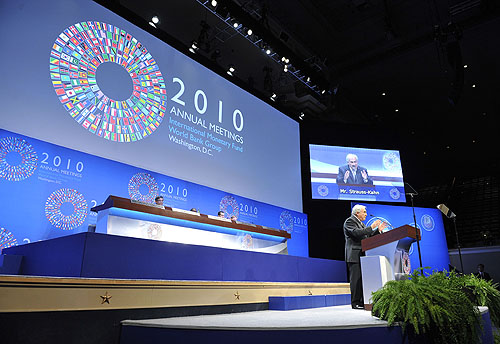 MORE EQUITABLE: IMF Managing Director Dominique Strauss-Kahn addresses the annual meeting of the IMF and the World Bank in Washington, D.C. on October 8. The recent agreement on a 6-percent quota shift will allow developing countries to play a bigger role in the IMF (ZHANG JUN) |